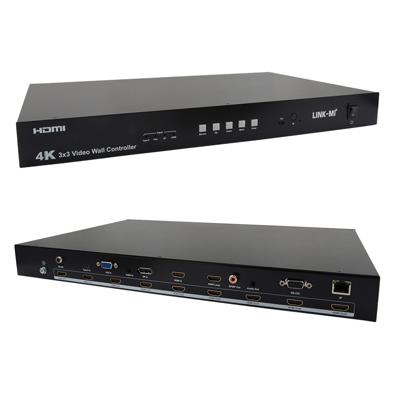 LINK-MI LM-VW03 یک کنترلر دیواری ویدئویی حرفه ای 9 کانال Ultra HD 4K است. برای توزیع سیگنال ها به چندین واحد نمایش برای اسپلایس نمایش استفاده می شود.با 4 سيگنال ورودي مثل 1 HDMI / 1 USB نوع C / 1 DP / 1 VGA؛ با 9 کانال خروجی HDMI، و 1 خروجی HDMI Loop اضافی برای نمایش تک یا کاسکادی.کاربر می تواند هر یک از 4 سیگنال ورودی را به نمایش در 9 مانیتور تلویزیون برای ایجاد یک دیوار ویدیویی بزرگ 3x3 یا 1x1، حالت های نمایش 1x3، 1x4، 2x2، 2x3، 2x4، 3x1، 3x2، 3x3، 4x1، 4x2...، و دیوارهای ویدئویی 3x4، 4x3، 4x4، 5x5، 6x6... حداکثر 10x10 در اتصال کشدی.